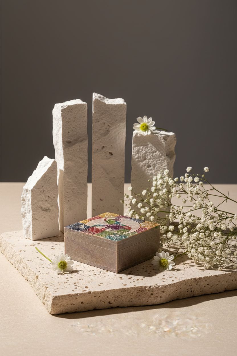 Dėžutė pagaminta iš natūralaus marmuro. Spalvų atspalviai gali skirtis nuo atspalvių nuotraukoje.